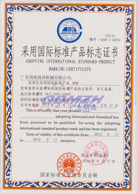 采用國際標準產品標志證書